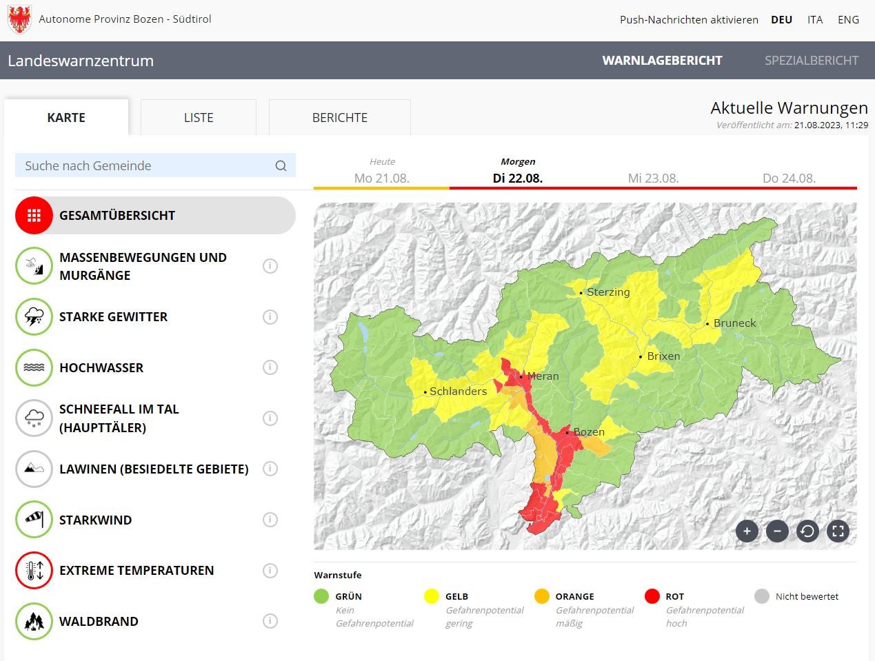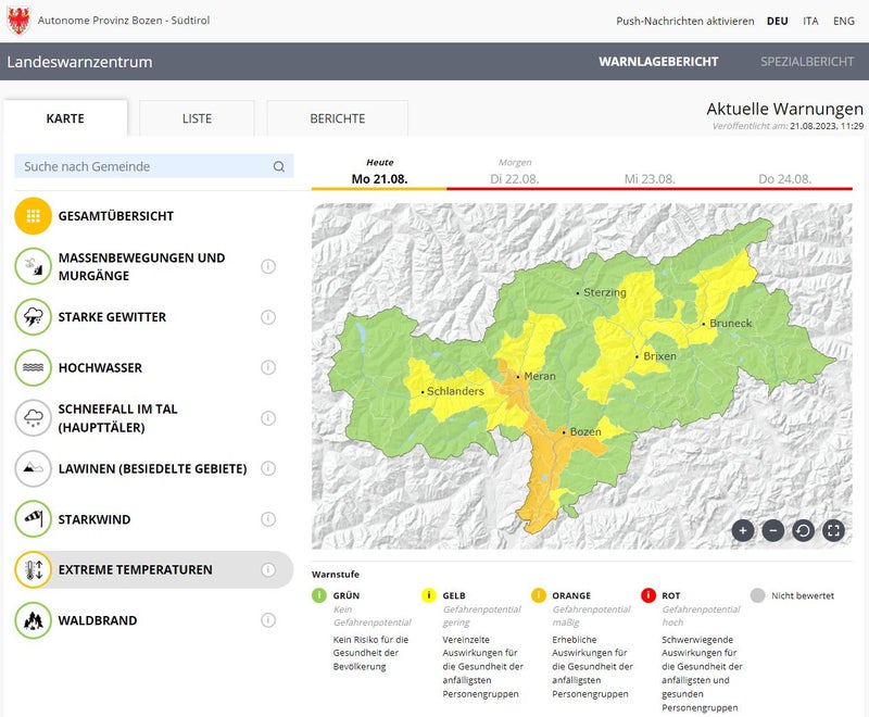 - Die Temperaturen im Raum Bozen und Meran steigen weiter an und erreichen 36 bis 37 Grad. Daher gilt ab morgen die Warnstufe Rot. Eine Abkühlung ist erst ab dem Wochenende in Sicht. Im Bild der Warnlagebericht von heute, 21. August (Quelle: Warnlagebericht des Landeswarnzentrums in der Agentur für Bevölkerungsschutz) » [IMG 198 kB]