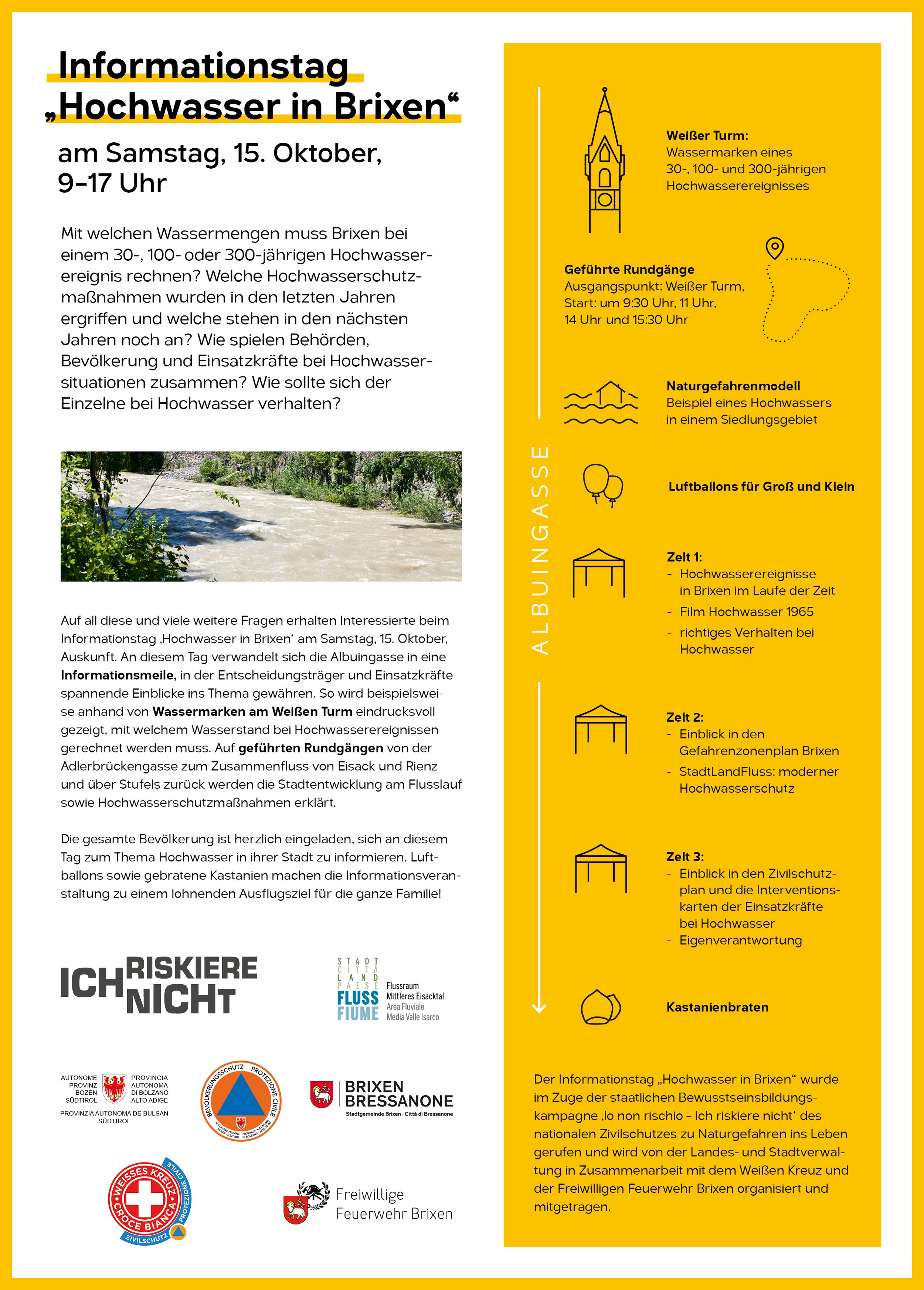 Der Informationstag "Hochwasser in Brixen" wird im Zuge der staatlichen Bewusstseinsbildungskampagne "Io non rischio – Ich riskiere nicht" des nationalen Zivilschutzes von der Agentur für Bevölkerungsschutz mit der Gemeinde Brixen in Zusammenarbeit mit dem Zivilschutz des Weißen Kreuzes und der Freiwilligen Feuerwehr Brixen organisiert und mitgetragen.