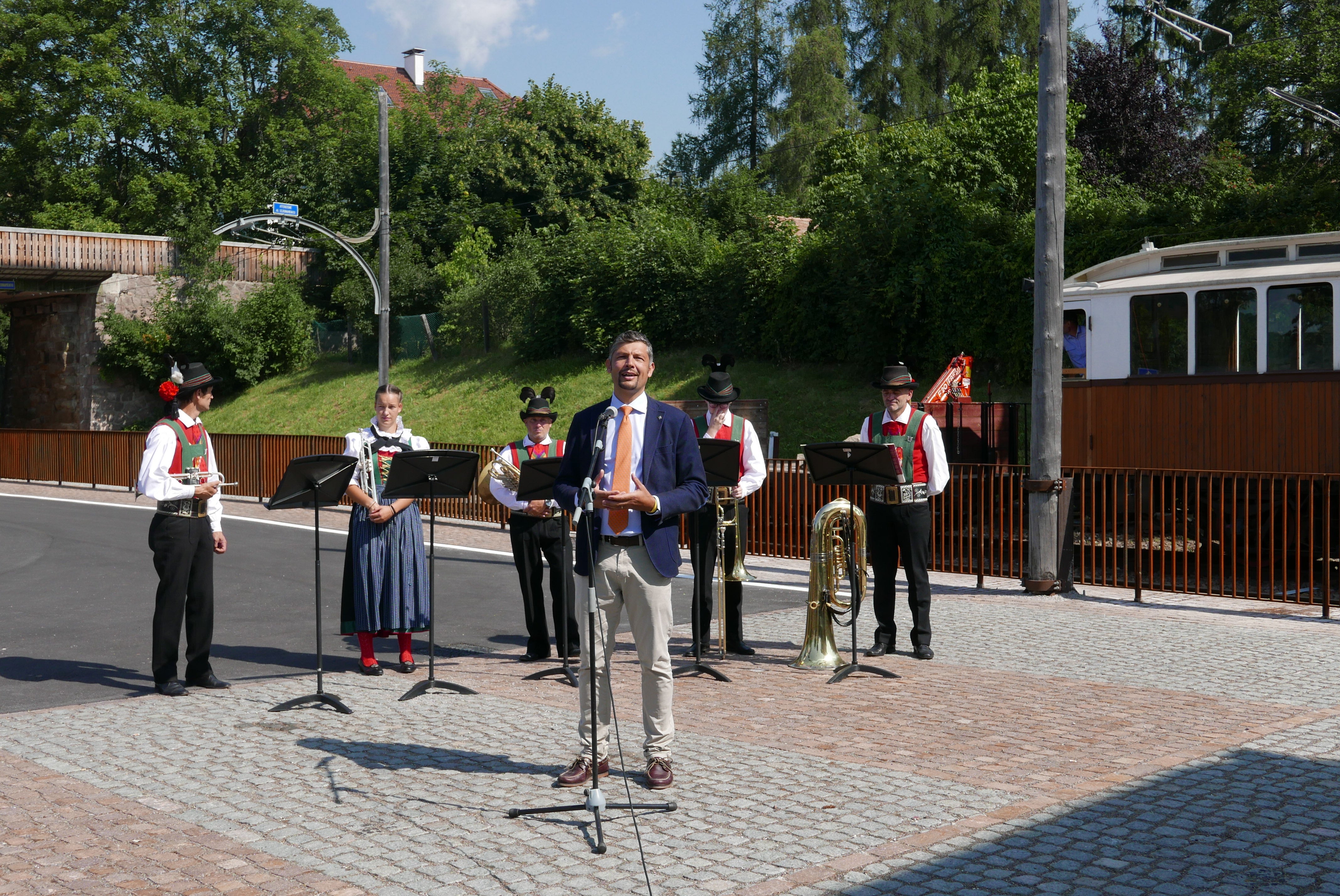 Seit April wurde in Klobenstein am Vorplatz des Bahnhofs gebaut, heute, 13. August, am 114. Geburtstag des Rittner Bahndls erstrahlt der Platz in neuem Glanz. Mobilitätslandesrat Daniel Alfreider, Bürgermeister Paul Lintner, Senator Dieter Steger, Markus Untermarzoner vom Rittner-Bahn-Komitee und STA-Generaldirektor Joachim Dejaco haben den Platz seiner Bestimmung übergeben.