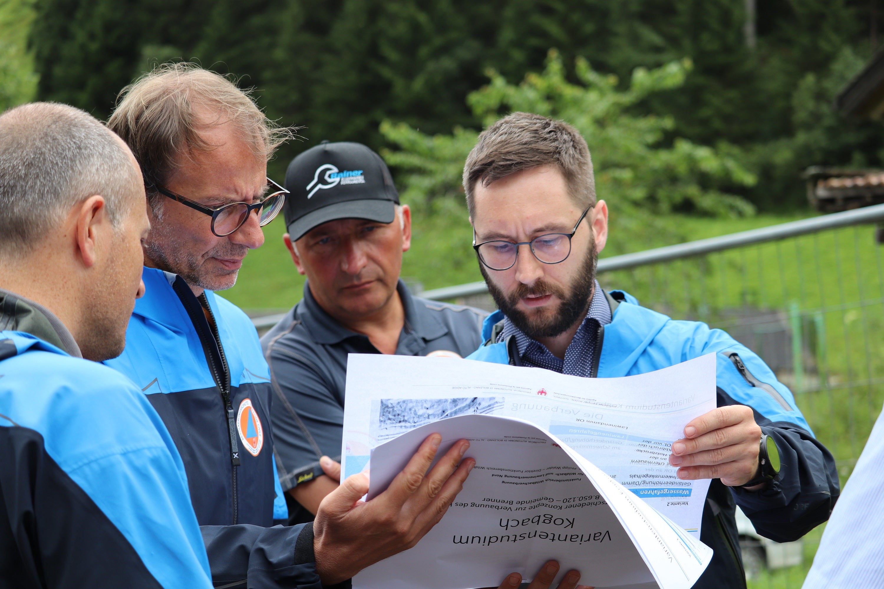 - Vor Beginn der Arbeiten am Toffringbach (mit den Plänen der Arbeiten am Kogbach) am 13. Juli dieses Jahres (v.l.): Amtsdirektor Philipp Walder, Bevölkerungsschutz-Agenturdirektor Klaus Unterweger, Vorarbeiter Roland Langgartner, Projektant und Bauleiter Jan Kobald (Foto: LPA/Maja Clara) » [IMG 1 MB]